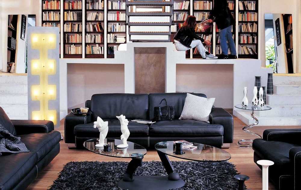 Как правило, темный диван сочетается со светлой комнатой. Желательно, чтобы стены были ограничены от картин и фотографий. В комнате должен быть абсолютный порядок и небольшой журнальный столик изготовленный из стекла.