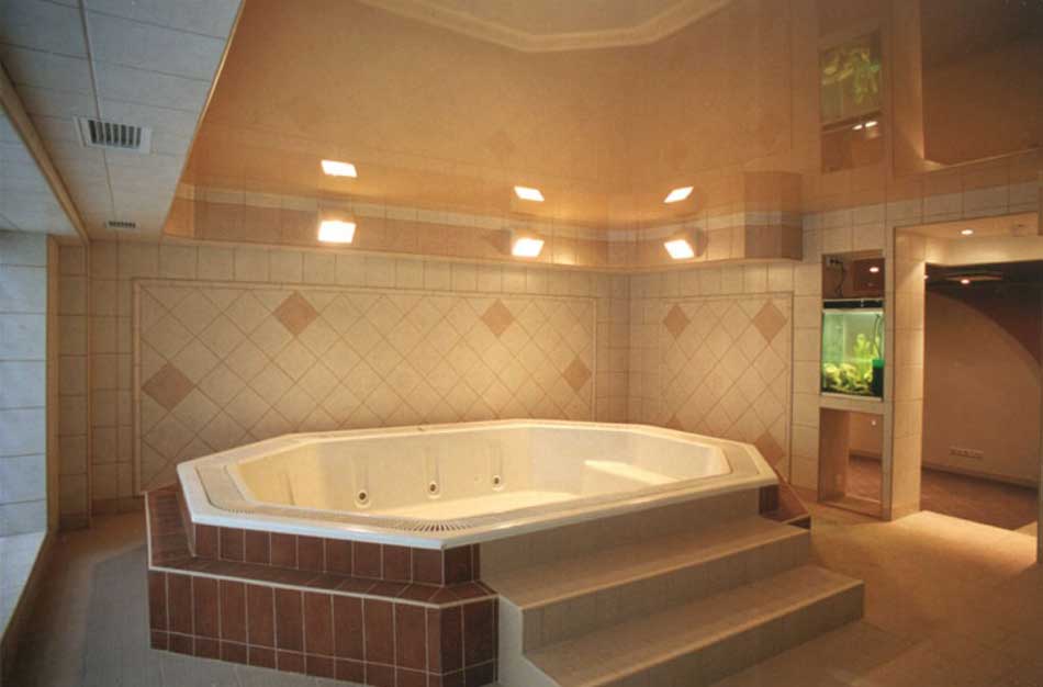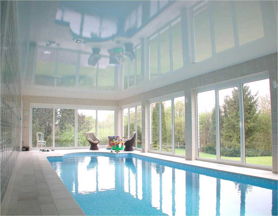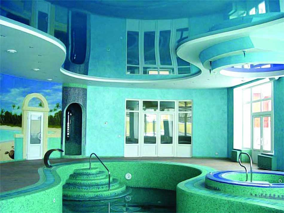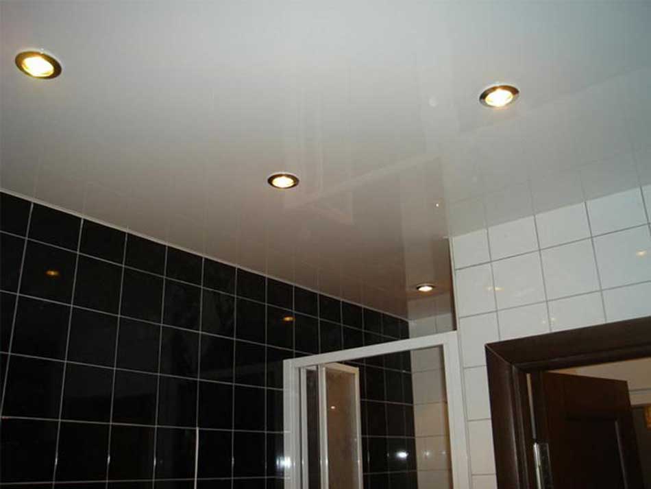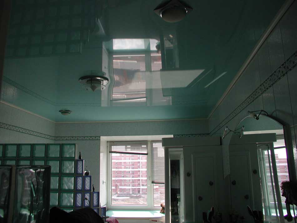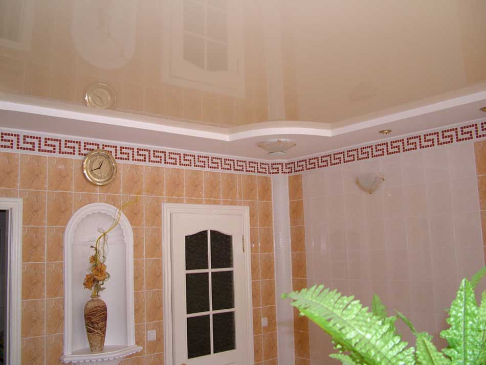 - Универсальность. Подходит для всех помещений, включая уборную. Не портится под воздействием влаги и высоких температур. Глянцевые потолки также актуальны для бани и бассейна.