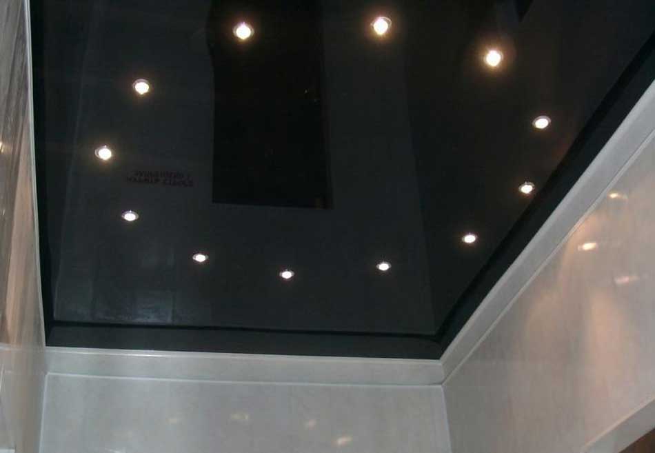 Глянцевый двухуровневый потолок чёрного цвета с точечным освещением зоны входа