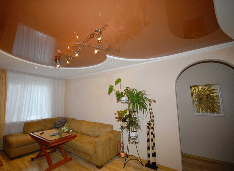 Как правило, в гостиной акцент в оформлении и стилистике направлен на элементы интерьера — мебель, текстиль, керамику. В этом случае, цвет, форма и общий стиль натяжного потолка будут вторичными. Их следует подбирать, отталкиваясь от общего дизайна помещения. Наиболее целесообразно применять двухуровневые конструкции, в которых можно использовать два сочетающихся оттенка, а также, при помощи освещения, зонировать гостиную на зону отдыха и место для работы или приёма гостей.