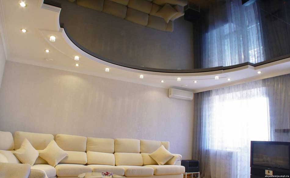 В качестве дополнительного освещения можно использовать скрытую подсветку. Она визуально увеличивает высоту потолочной поверхности, создавая эффект парения. Если потолочная поверхность имеет незначительные неровности, лучше применить арочную модель потолка, которая создает плавный переход к стене. Оригинально смотрится гостиная комната с потолочным покрытием, оформленным в черный цвет с белоснежными вставками и элементами декора.