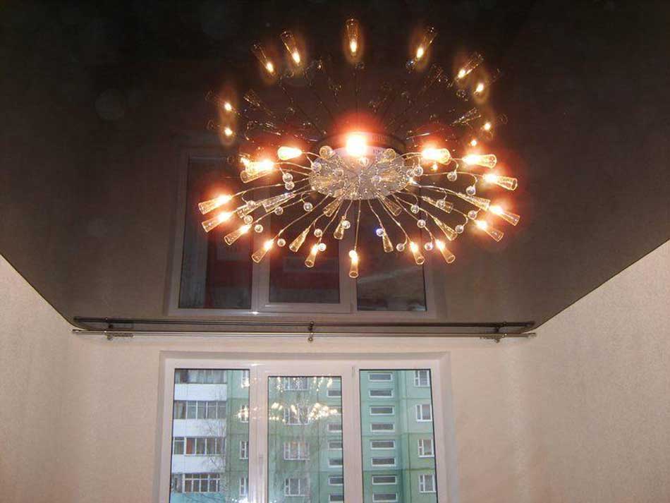 Натяжные потолки черного цвета по практичности ничем не отличаются от решений иных расцветок цветов и из других полотен: