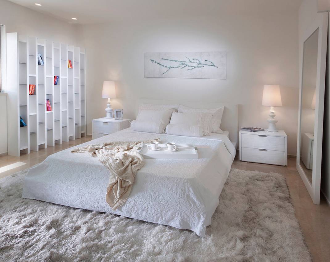 Поскольку мебель в спальню все чаще выбирают именно белую, мягких очертаний, то покрытие такого же цвета, прямоугольное, со скругленными углами, овальное или круглое будет идеальным дополнением. Прекрасно, если ковер с высоким ворсом займет почти всю комнату, чтобы можно было спокойно ходить по ней босиком, но если такой возможности нет, достаточно прикроватных мягких покрытий.