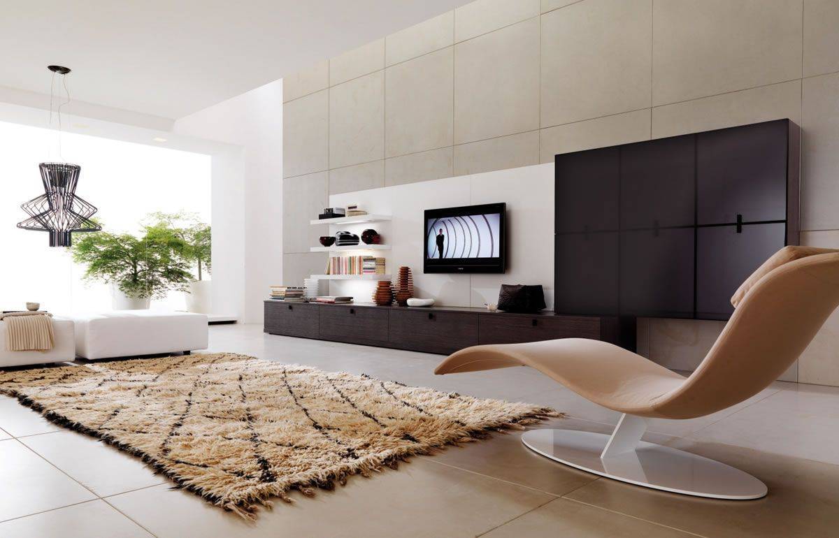 - Белый ковер – как чистый лист. Он создает отличный фон для «лепки» любого интерьера и расстановки всевозможных акцентов, а может и сам выступить отличным дополнением – если комната в целом выполнена в темных тонах.