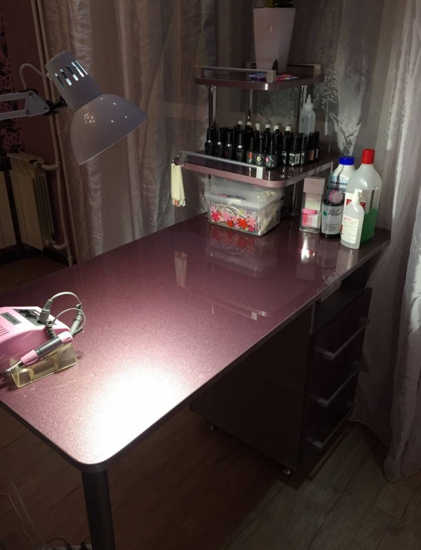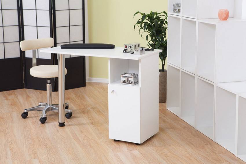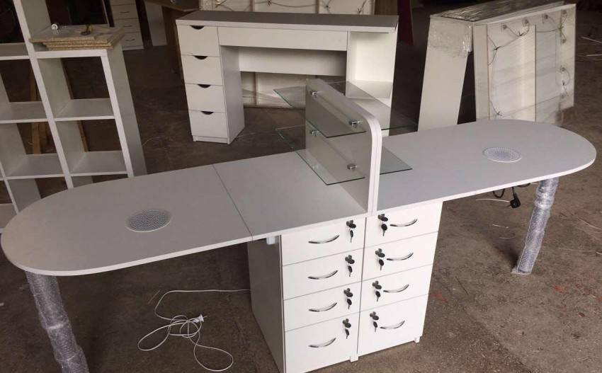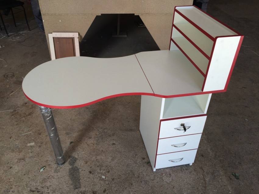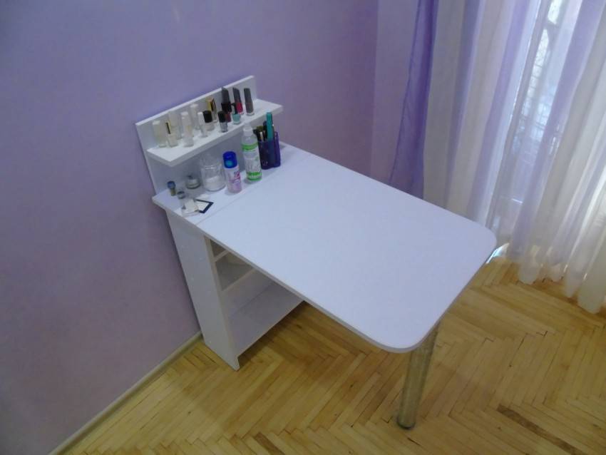 Для удобства использования в комплект маникюрного стола обычно входят тумбочка с дверцей и полочки для хранения разных приборов, приспособлений и прочего материала для работы мастера. Раскладной стол позволит сэкономить место и как правило за основу берут конструкцию стола-книжки.