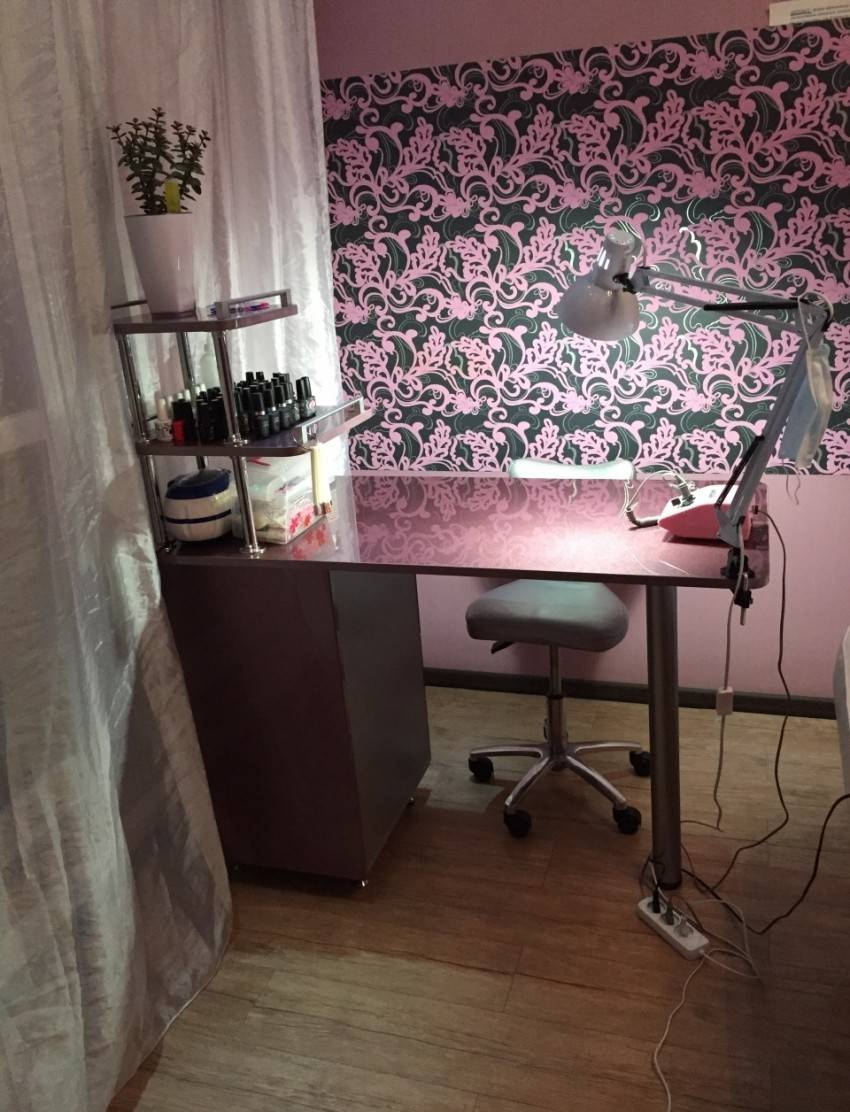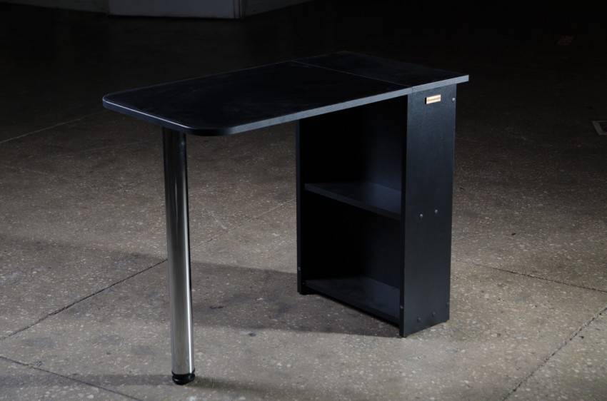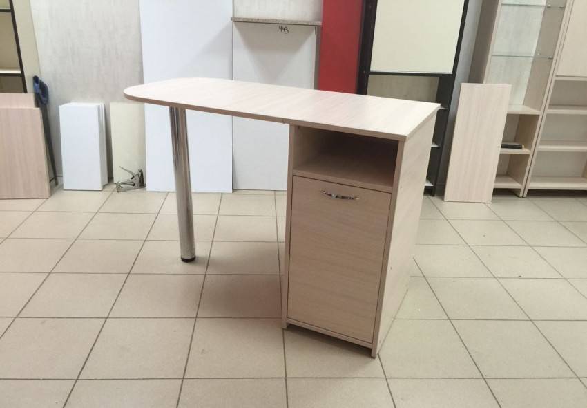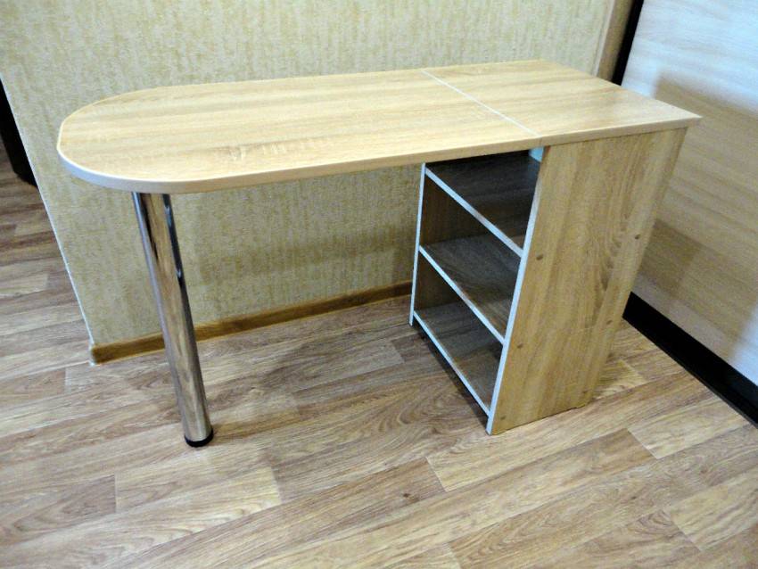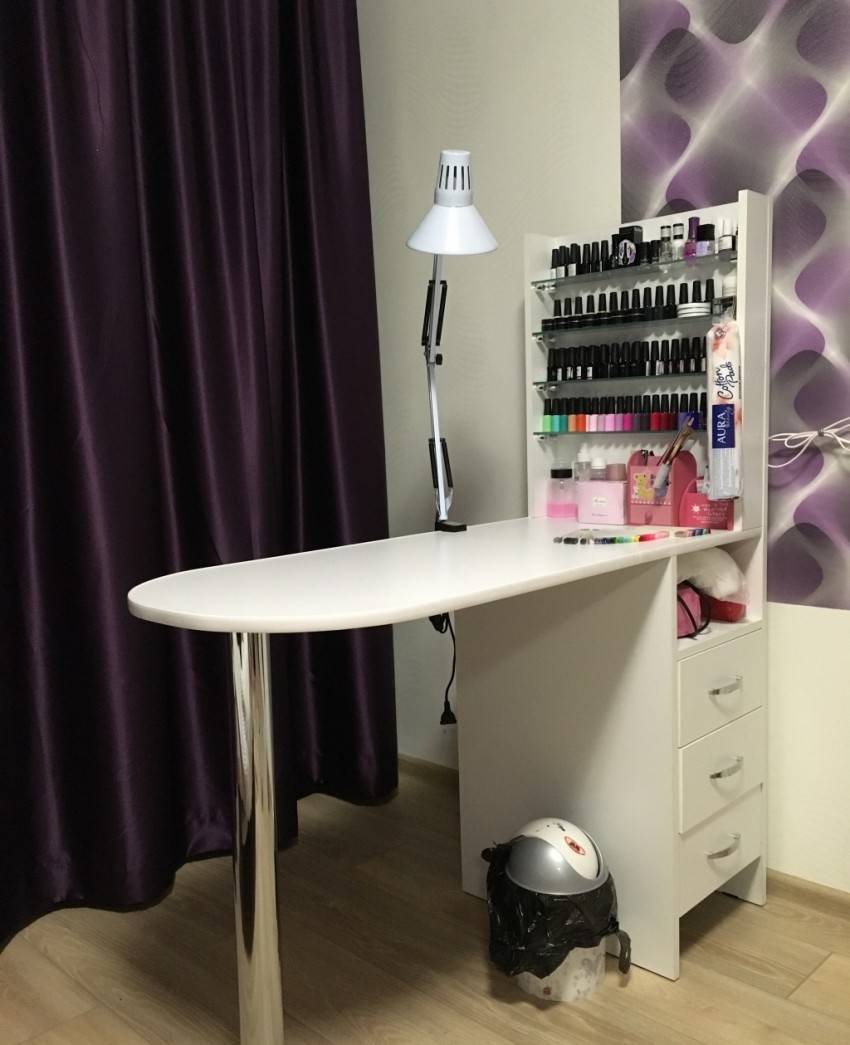 Для удобства использования в комплект маникюрного стола обычно входят тумбочка с дверцей и полочки для хранения разных приборов, приспособлений и прочего материала для работы мастера. Раскладной стол позволит сэкономить место и как правило за основу берут конструкцию стола-книжки.