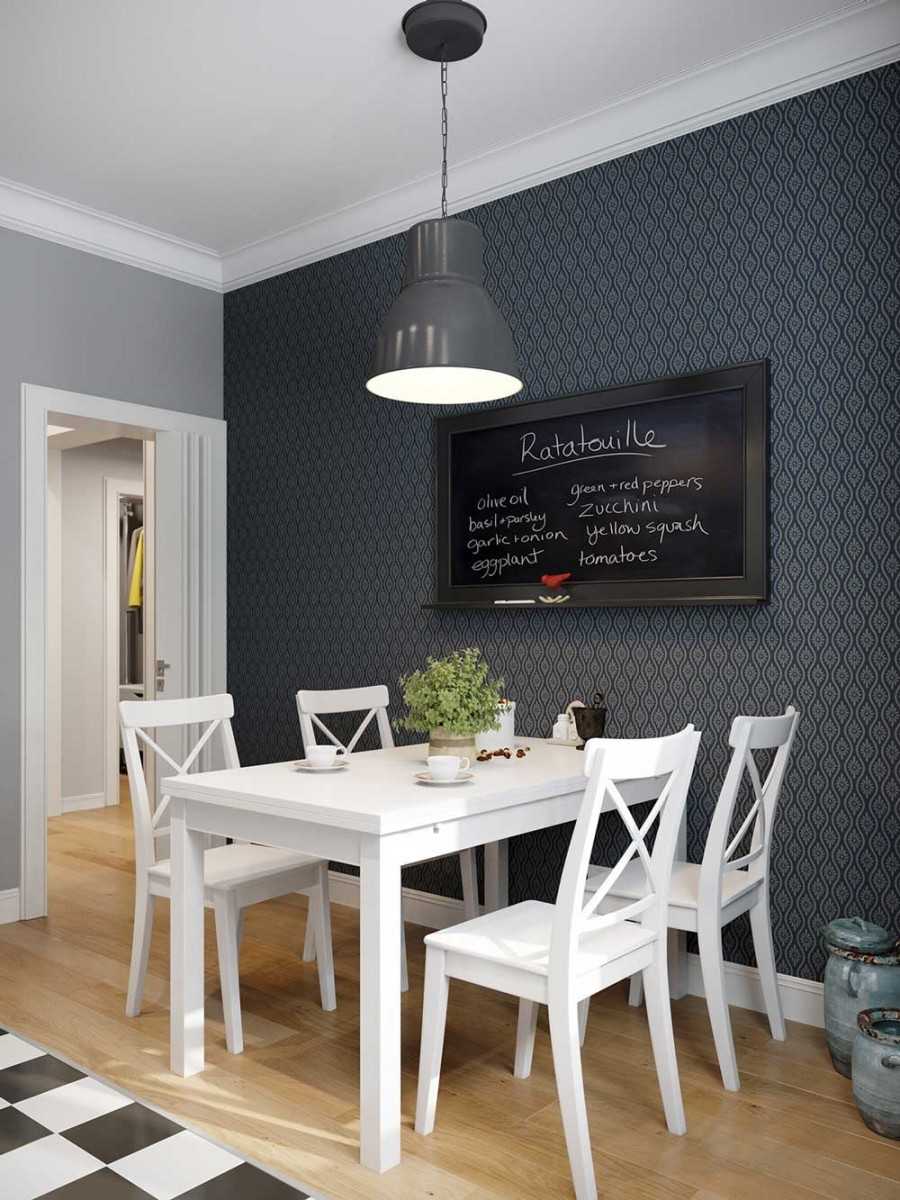 - Черно-белая скатерть вписывается в ретро-интерьер. Пусть на столе будет портрет Мэрилин Монро или Чарли Чаплина.