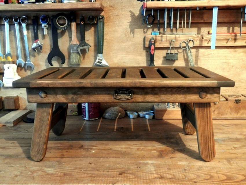 Дерево или плиты из деревянной стружки – ОСБ, МДФ, ДСП (в данном случае возьмем последнее). Пленка ПВХ для заделки столешницы и других частей стола, бруски для ножки, клей, различные мебельные петли, саморезы, шканты или полкодержатели. Среди прочего пригодятся рулетка, отвертка или шуруповерт, утюг, сверла.
