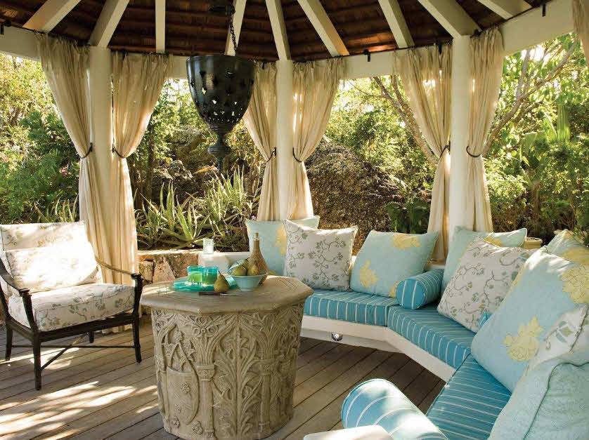 Занавески на окнах, чехлы и пледы на стульях и скамейках могут довольно быстро придать беседке необходимую направленность. Например, подобрав текстиль голубых тонов, с элементами ракушек, рыб, якорей и штурвалов можно создать атмосферу морского стиля.