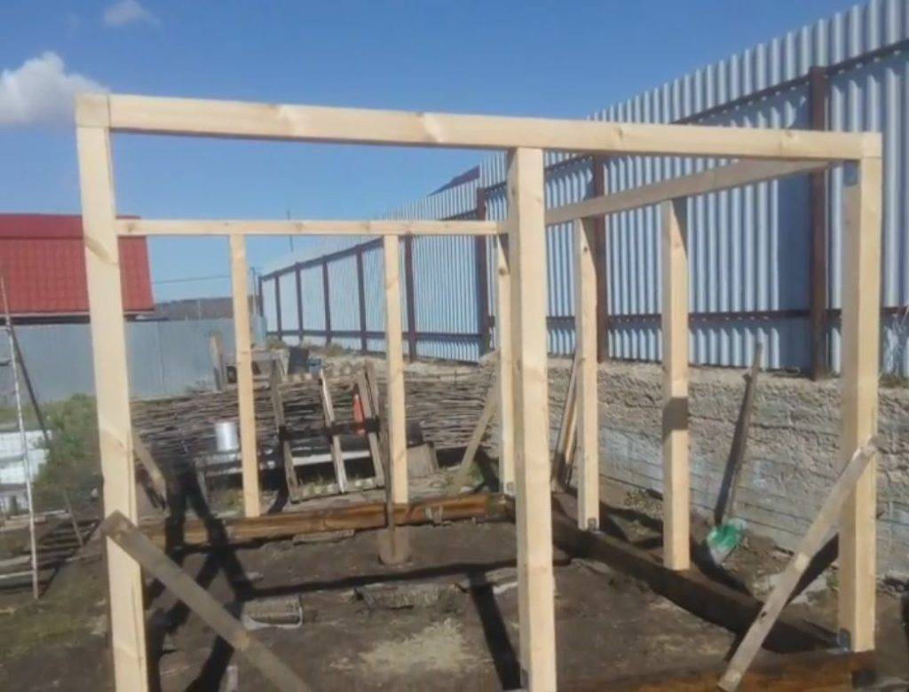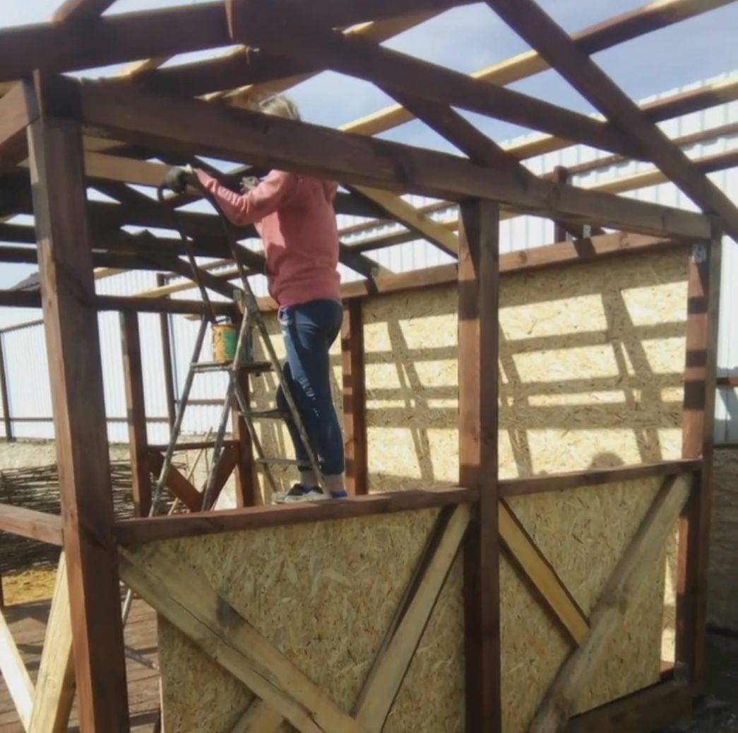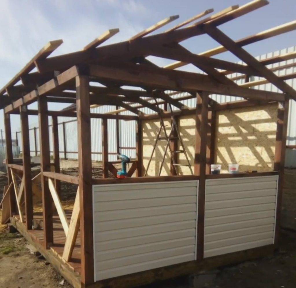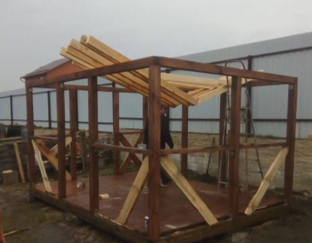 Рекомендуется использовать поддоны хорошего качества, чтобы они смогли выдержать нагрузку крыши. Стропильную систему можно зафиксировать после установки всех стен или после установки опорных брусьев. Крышу можно сделать из гибкой кровли, поликарбоната или шифера. Полы нужно обработать специальным средством, чтобы избежать гниения и появления грибка.