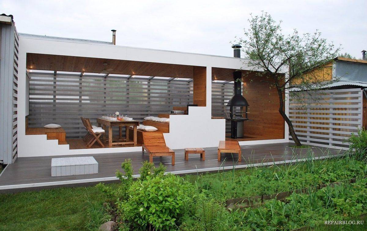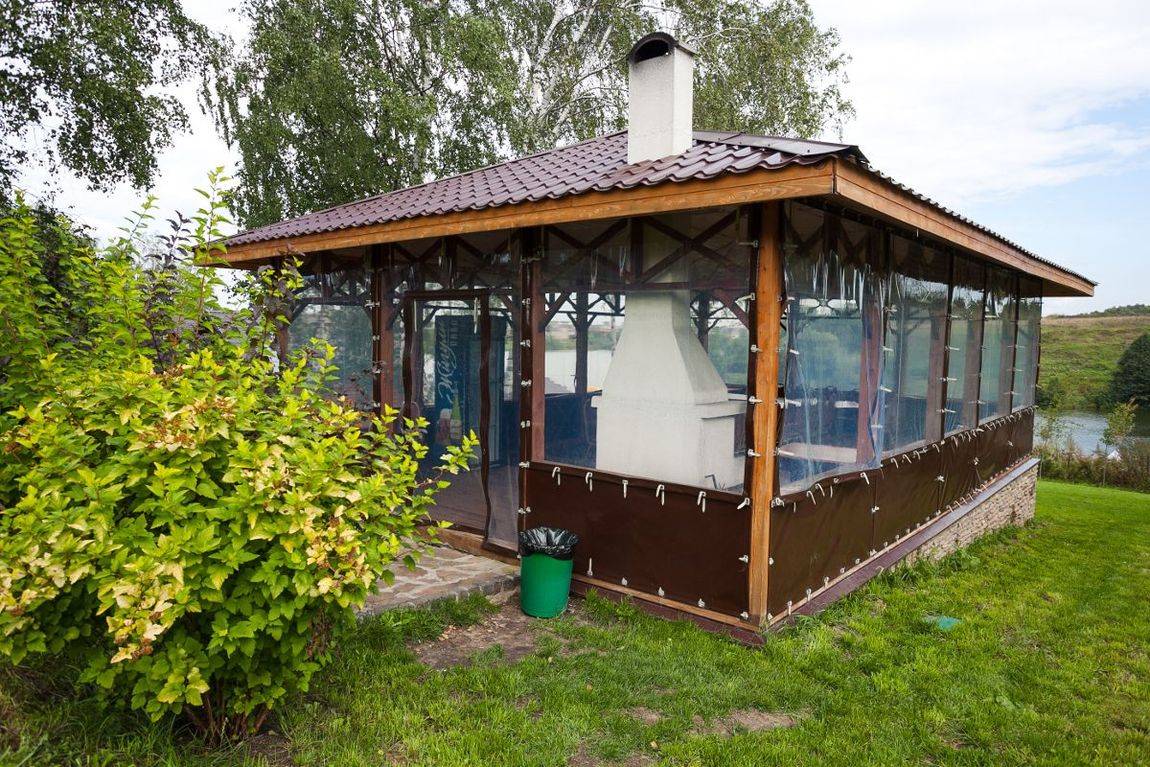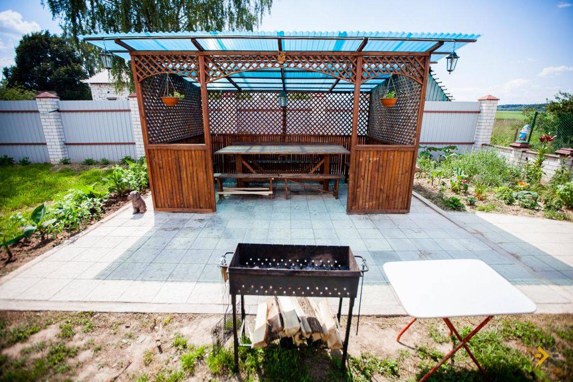 Имеет значение соответствие стилю оформления всего участка и гармоничное включение в ландшафтный дизайн территории. Многие хозяева даже небольших участков стараются обзавестись беседкой. Но в этом случае не рекомендуется размещать на территории громоздкие и капитальные строения. Лучше обзавестись небольшим навесом или крытым тканевым тентом, рядом с которым можно разместить небольшой мангал или барбекю. Он может быть изготовлен или ПВХ или натуральной ткани. Это позволит при необходимости быстро убрать такую беседку и использовать участок для других нужд. Огромным минусом такого варианта является невозможность использования в ветреную погоду и зимой по понятным причинам.