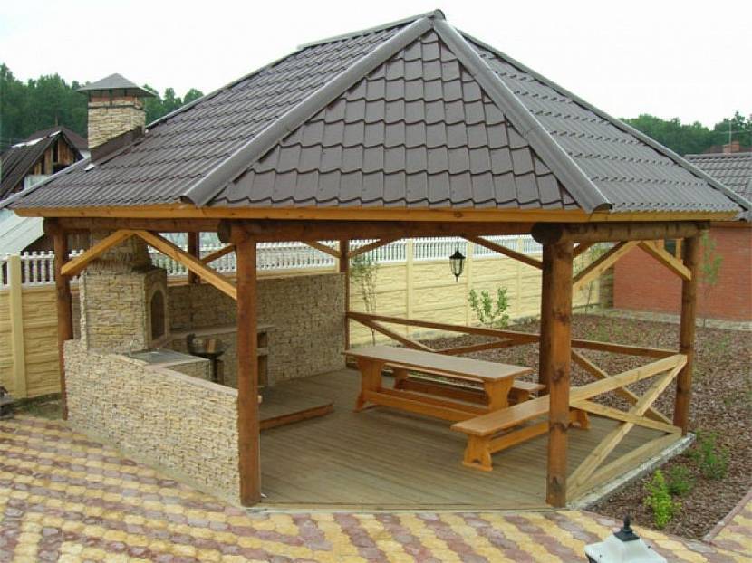 Что касается выбора материалов для постройки беседки, в которой предполагается разместить очаг, то тут стоит отталкиваться от нескольких аспектов.