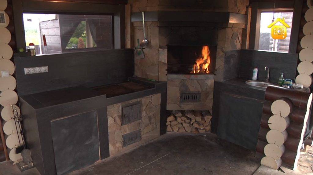 Он представляет из себя массивное кирпичное сооружение, которое устанавливается на отдельный монолитный фундамент, позволяющее готовить в разных форматах — варить плов на плите, запекать мясо в печи и так далее.
