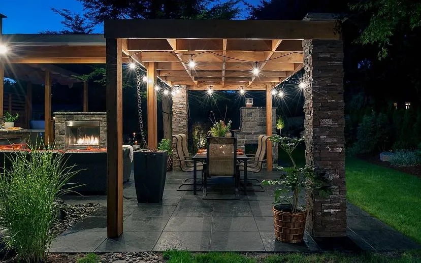 Архитектуру современного загородного дома подчеркнет беседка из дерева и камня. Стильно и современно смотрятся сооружения, крыша которых выполнена из поликарбоната.