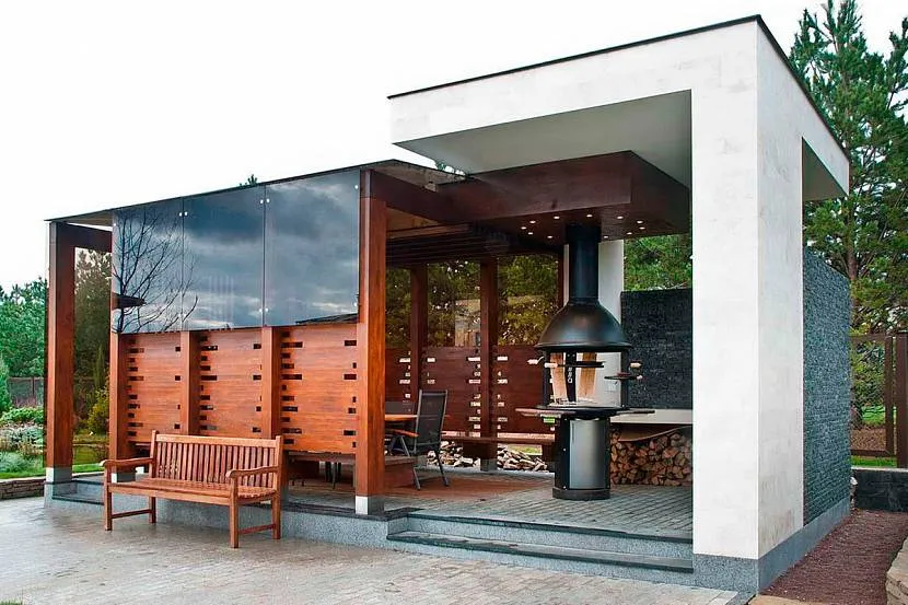 Главная черта минимализма и хай-тека — строгая геометрия конструкции, включая крышу, которая в основном проектируется плоской. В строительстве применяется много промышленных материалов: металл, стекло, пластик. Беседка оформляется в строгой цветовой гамме, к ней часто подводится искусственное освещение. В таком интерьере не обойтись без современного мангального комплекса и минимально декорированной мебели.
