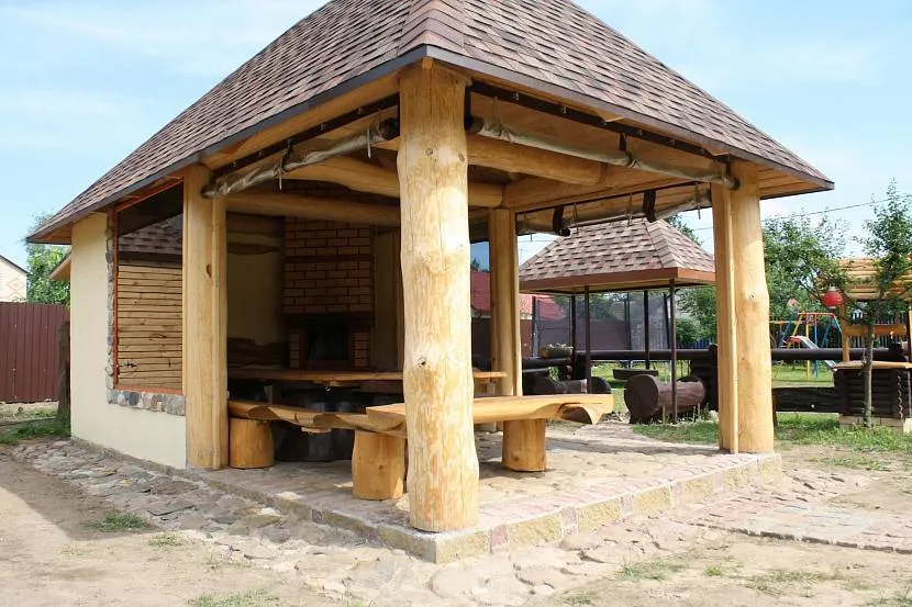 Это сооружение часто строится из дерева. В этом случае мангальную зону возводят из материалов негорючего типа. Достоинства деревянной конструкции: