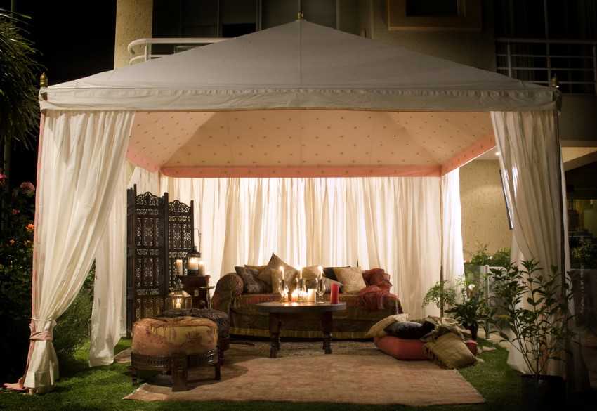 Сделанные вручную. Впрочем, у созданных вручную павильонов тоже есть преимущества. Главное – возможность сделать все в соответствии со своими задумками. Если делать беседку-шатер с нуля, то можно просчитать все до последних мелочей: будет она массивная, или легкая и компактная, простая, или украшенная огромным количеством декоративных элементов. Все ограничивается только возможностями человека, который берется за работу.