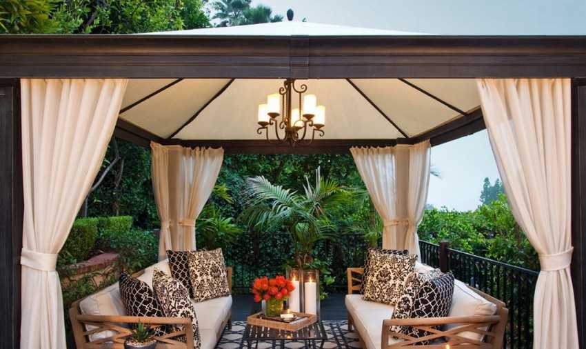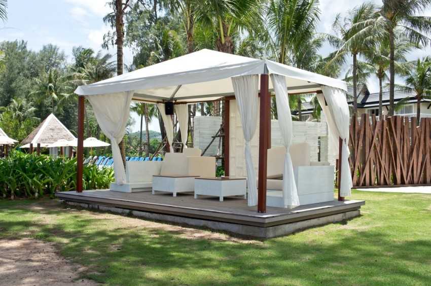 - Легкую, открытую конструкцию с дощатой оградой и полом, вымощенным ракушечником или плиткой. Стенами служат полупрозрачные шторы (например, из органзы) и сети. Для крыши подойдет мягкая черепица или натуральные материалы — тростник или солома.