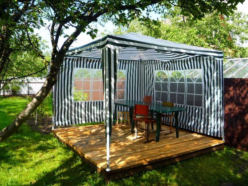 Поставленное своими силами сооружение, будет не только украшать участок, но и защитит вашу семью и гостей от жаркого солнца летним днем и даст возможность наслаждаться прохладой вечера. Помимо этого, оригинальная беседка из тента будет дополнять окружающий ландшафт.