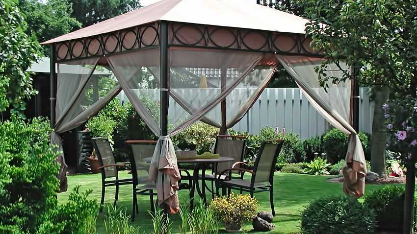 Довольно практичным вариантом является беседка с москитной сеткой, которая в вечернее время прекрасно защитит людей от комаров и других насекомых. Также эта сетка, хоть она и является прозрачной, довольно неплохо прикрывает сидящих внутри людей, поэтому благодаря ей можно даже немного уединиться.