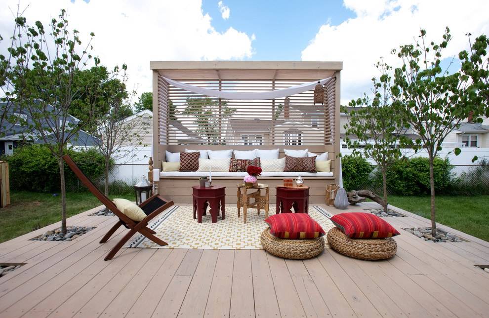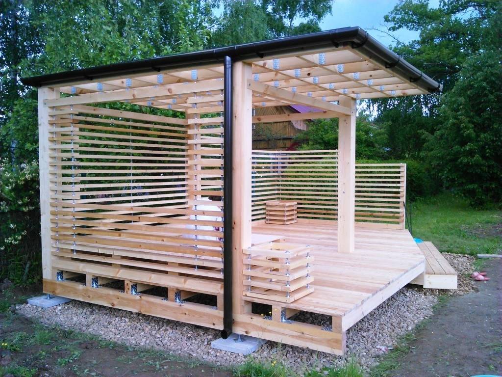 Однако в большинстве случаев строится бюджетная, простая беседка, в которой можно скрыться от дождя и поесть шашлыки. Используйте деревянные рейки, для того чтобы создать красивые решётчатые стенки строения.