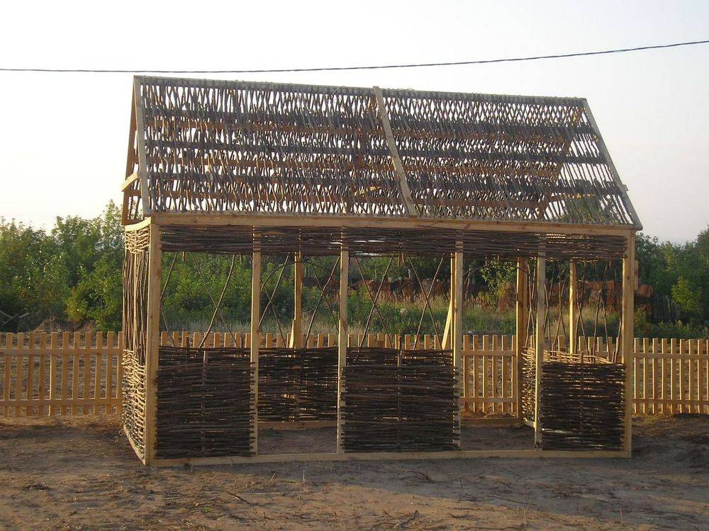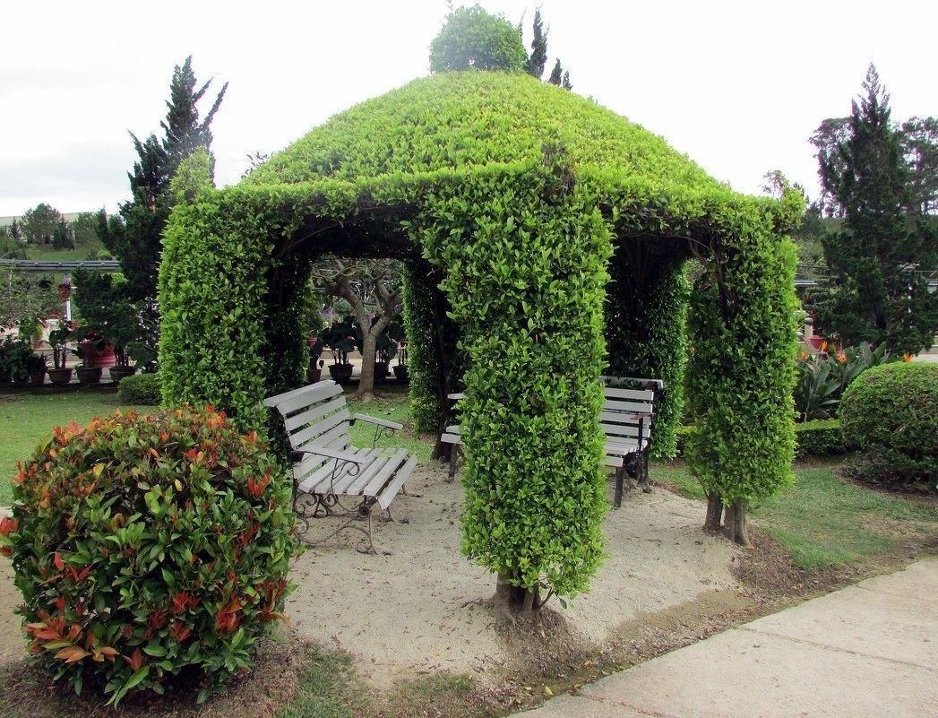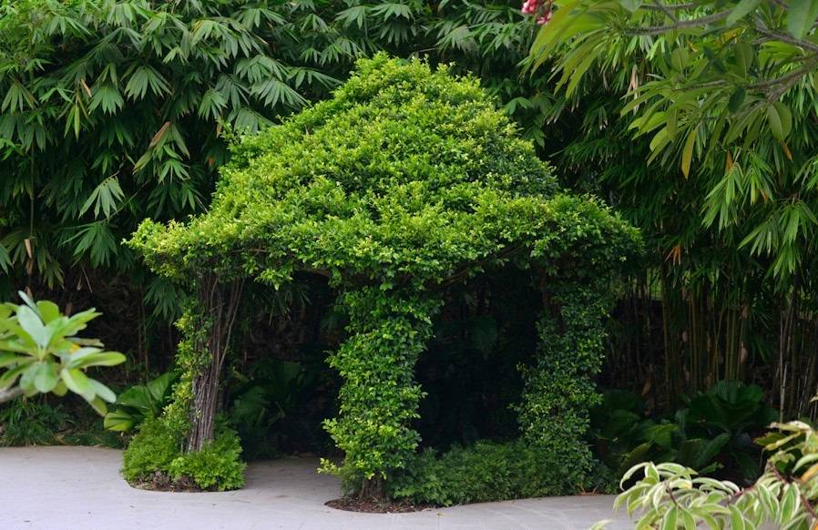 - выращенной – это самый сложный вариант. Для его создания нужно высадить деревья и по мере роста менять их форму так, чтобы они переплетались, создавая стенки и крышу;