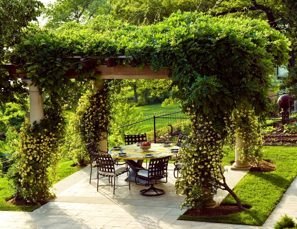 Если вы хотите накрыть террасу, чтобы иметь возможность использовать ее также во время сильной жары и летнего дождя, то следует подумать о строительстве легкой беседки. Пергола — самая распространенная деревянная конструкция, стоящая на сваях. Растения могут представлять собой эстетический способ добиться тени в саду. Верхнюю часть перголы можно покрыть легкими материалами, такими как трапециевидные или гофрированные панели из полиэстера, ПВХ и дерева. Для сторонников природы и естественного регулирования дневного света в беседке рекомендуется пергола с кожухом. Густая листва способна остановить мелкий дождь летом, дать желаемый оттенок и обеспечить естественный воздушный поток. В свою очередь, зимой она раскроет пространство над террасой и позволит туда свободно проникать солнечным лучам, желаемым в это время года. Прежде всего, это будет привлекательным украшением всего имения.