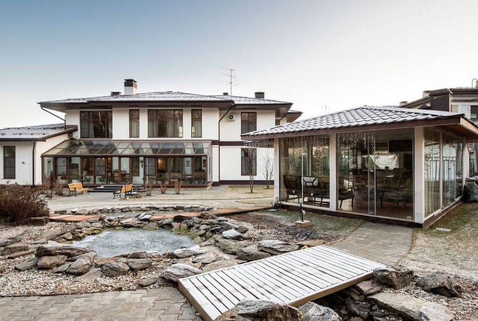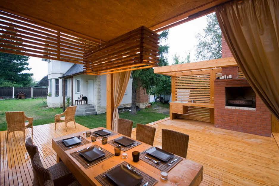 Это строение можно назвать промежуточным звеном между открытой беседкой и дачным домом. Стены могут быть изготовлены из деревянной решетки или закрыты полностью. Если у беседки сплошные капитальные стены, ее можно использовать не только в летний период, но даже зимой, в случае наличия системы отопления.