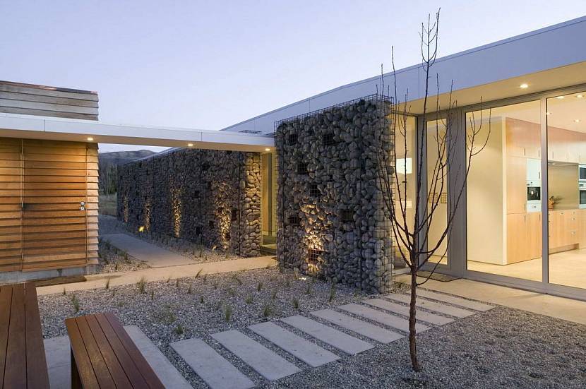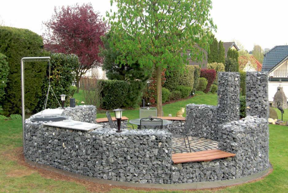 . Постройка прекрасно смотрится в окружении хвойных растений и камней; рядом с альпийской горкой и склоном, поросшим густой травой.