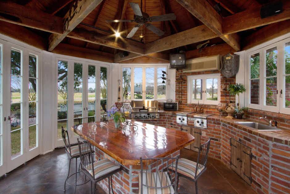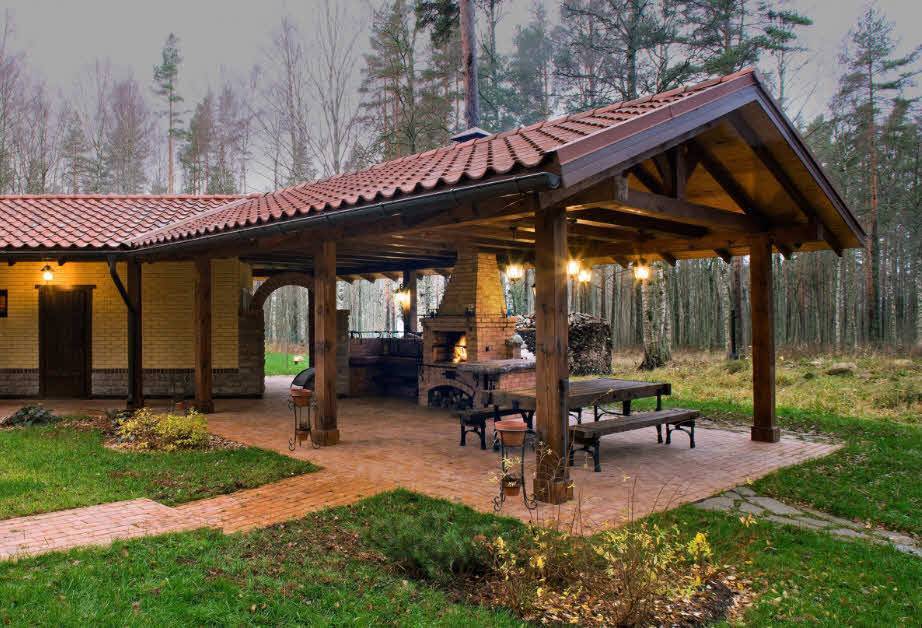 Если Вы любитель провести время в большой веселой компании, да еще и под приятный запах готовящегося на огнях мяса или рыбы на свежем воздухе, то этот вариант для Вас. Такие беседки состоят не только из столовой зоны, но и зоны готовки, где может располагаться барбекю, мангал, коктальница или целый комплекс для приготовления разных блюд. Такая беседка может быть открытого или закрытого типа (с хорошей системой дымоотвода), в материалах здесь особых ограничений нет, главное, чтобы зона нагрева не соприкасалась с легковоспламеняющимися или взрывоопасными материалами.