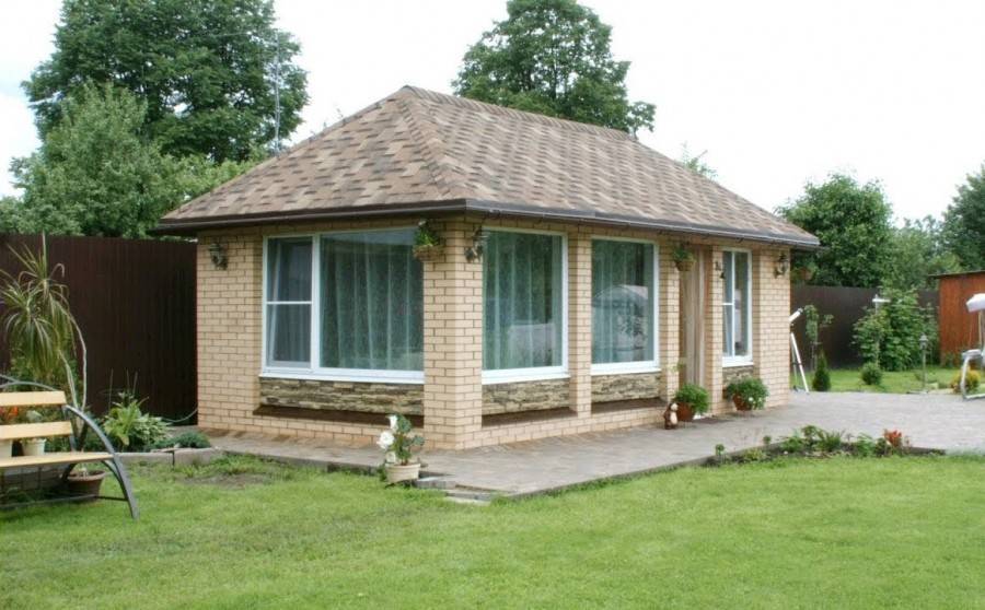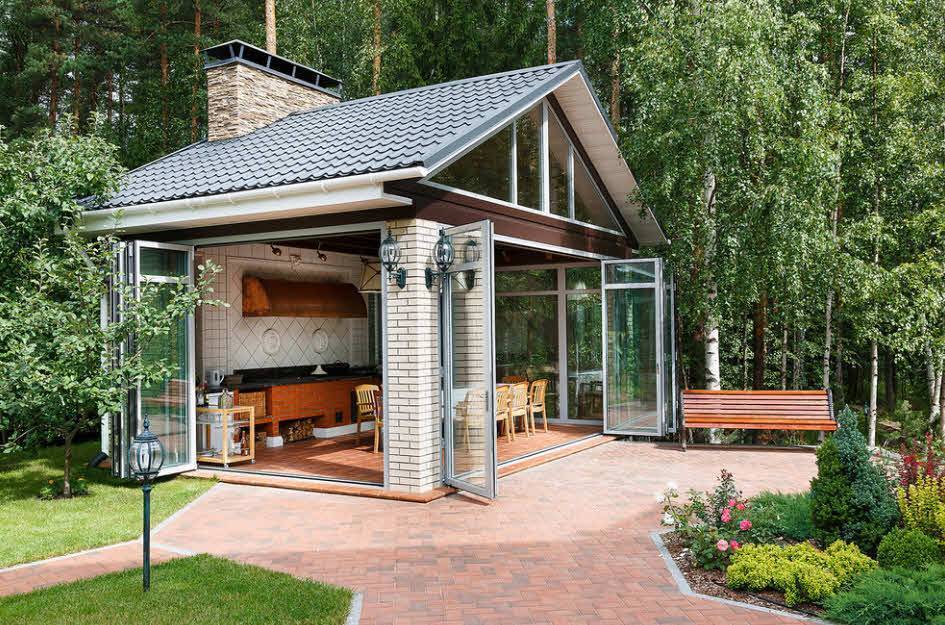 Беседка может быть с гостевым домиком или быть частью гаража.