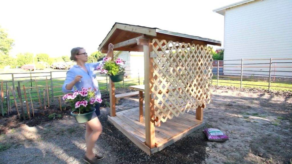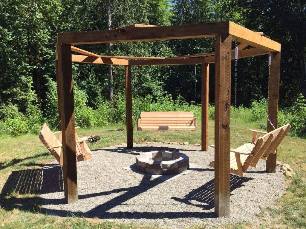 Конечно, не обязательно делать для вашей беседки платформу или даже включать все другие структурные элементы, которые есть в традиционной беседке. Классная интерпретация деревянной беседки своими руками представлена выше и включает только простые рамы, построенные вокруг мангала с качелями у него.