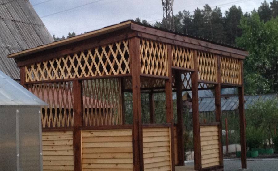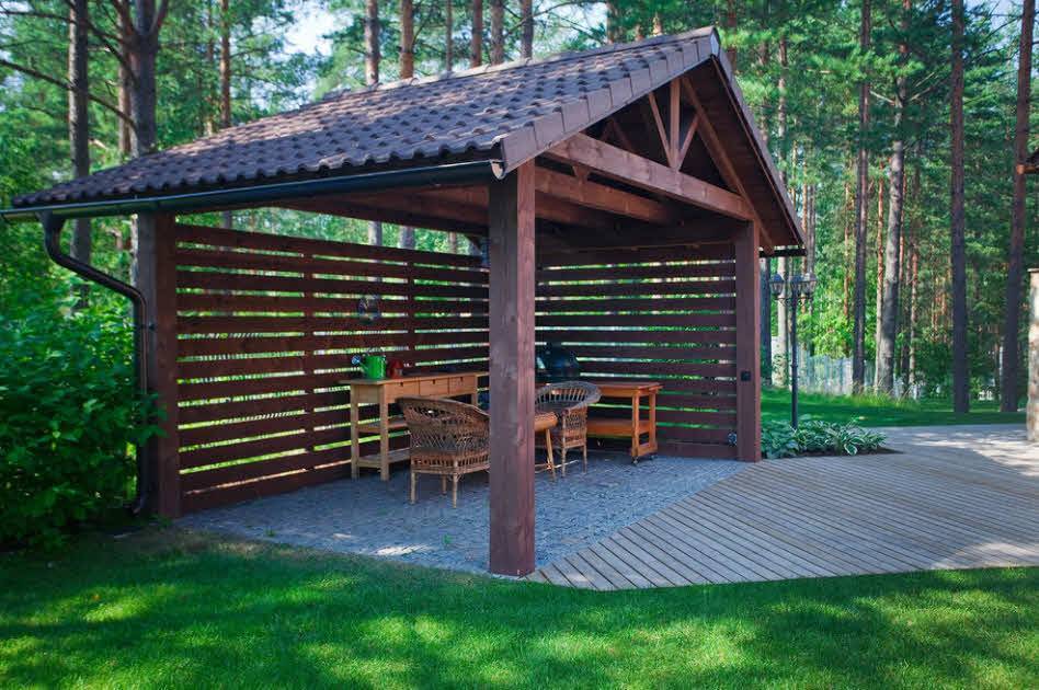Это строение можно назвать промежуточным звеном между открытой беседкой и дачным домом. Стены могут быть изготовлены из деревянной решетки или закрыты полностью. Если у беседки сплошные капитальные стены, ее можно использовать не только в летний период, но даже зимой, в случае наличия системы отопления.