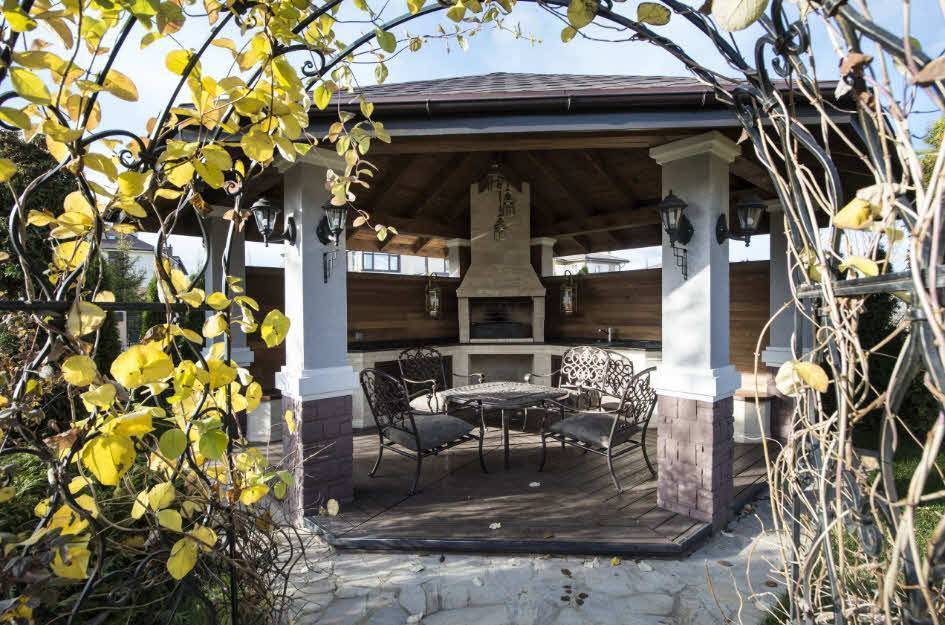 Садовые беседки все чаще оборудуются дорогостоящим высокотехнологичным оборудованием – грилем, барбекю, каминами, Wi-Fi, уютной мебелью и домашними кинотеатрами.