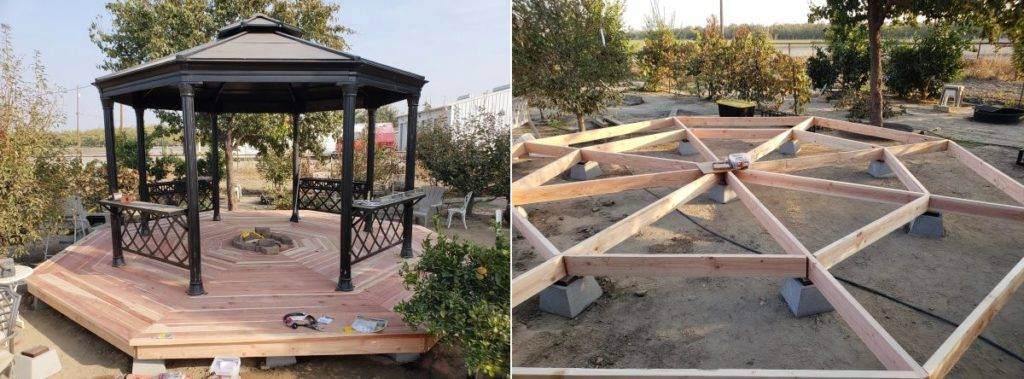 У традиционной беседки всегда есть основание, представляющее собой платформу, которая расширяется вокруг нее, иногда образуя своего рода небольшую палубу, которая обрамляет беседку и имитирует ее форму или форму крыши.