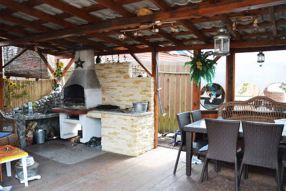 Разделочный стол, электроплита, мойка и холодильник – необходимые для обустройства атрибуты. Непосредственно для застолья понадобится обеденная группа, которую лучше выбрать из вариантов садовой мебели. Такая постройка обеспечит комфортную готовку на свежем воздухе, тут же можно собрать семью за столом. Этот вариант прекрасен для тех, кто не любит стоять у плиты в душной кухне в доме.