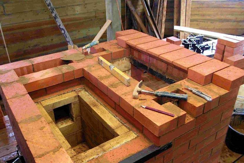 Огнеупорные кирпичи (подобный вид называется «шамотный кирпич») выкладывают на фундамент, скрепляя элементы раствором из глины, песка и цемента.
