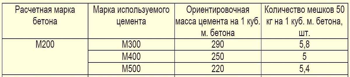 Расход цемента для бетона марки М200 на один кубометр раствора