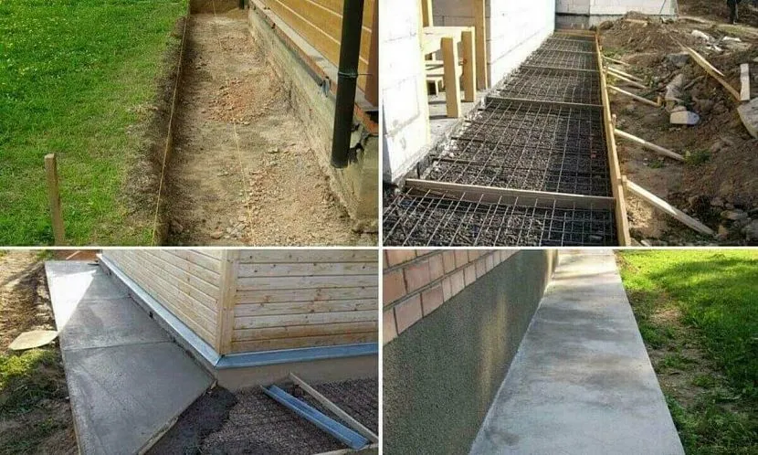 Четыре этапа возведения отмостки: траншея, армирование, заливка, набор прочностиИсточник Ivgarant.ru