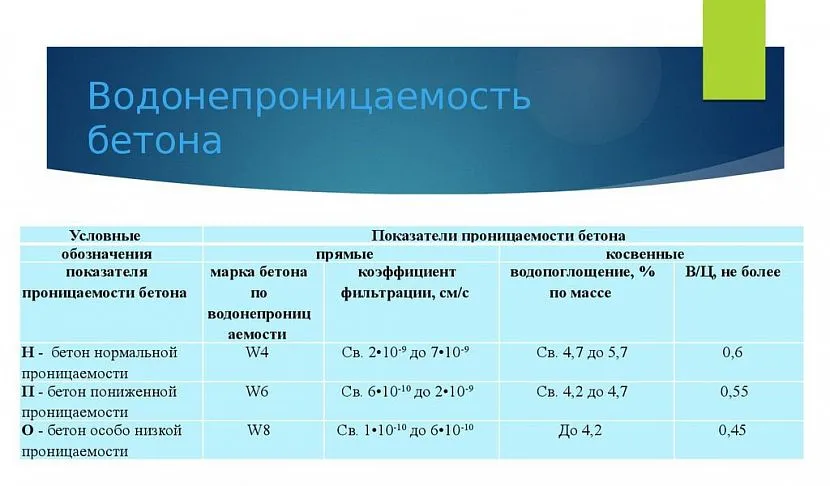 Таблица классов водонепроницаемости бетонаИсточник Ppt-online.org