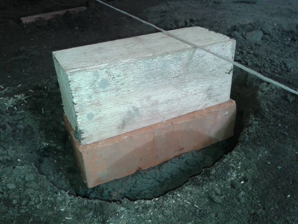 Устройство кирпичных столбиков под лаги. Кладка кирпича осуществляется «вперевязку» в три ряда сечением 25х25 см.