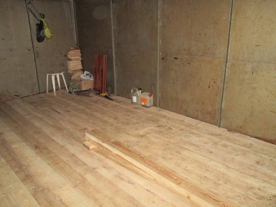 Укладываем доски пола по лагам и фиксируем с помощью саморезов и гвоздей. Между стеной и доской оставляем зазор 3–4 см, который потом закрывается плинтусом.