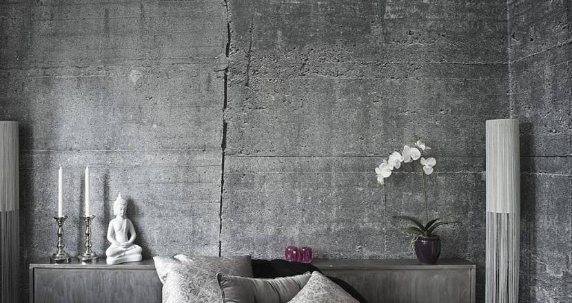 Рулонный бетон, обои и фотообои. Рулонный бетон – это гибкое полотно, состоящее из минеральной муки толщиной до 5 мм. Наносится на стену при помощи специального клея. Обои и фотообои, пожалуй, один из самых простых способов отделки. Фотопечать может с точностью имитировать узор.