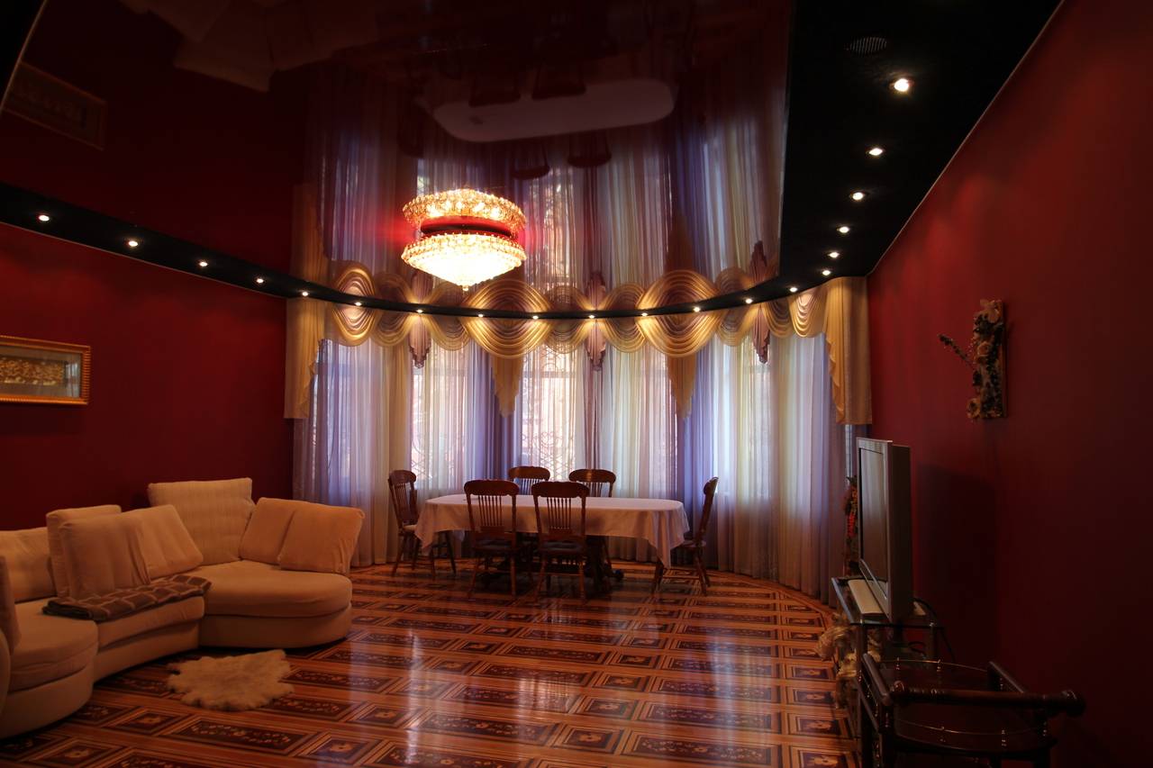 В просторном зале можно реализовать различные идеи. Плоский однотонный верх выглядит неинтересно. В данном случае стоит проявить фантазию, использовать гипсокартонную конструкцию, состоящую из нескольких уровней, с подсветкой. Она оригинальна, позволяет скрыть воздуховоды кондиционеров и другого оборудования.