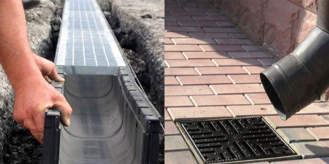 Для монтажа системы отвода воды применяются элементы дождевой канализации. Установка проводится с помощью пластиковых труб различного диаметра, которые можно подключить к резервуару или канализации. Для отвода воды с тротуарной плитки и брусчатки используются стоки.