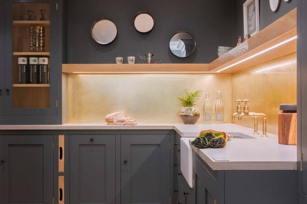 Серые фасады позволяют быть смелее в выборе дизайна фартука. Яркая плитка или скинали помогут сделать яркий акцент.