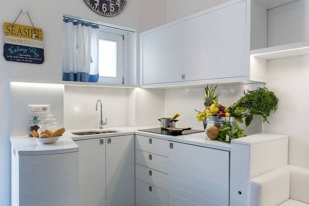 Бытовая техника должна только подчеркивать дизайн. Соответственно, для светлого гарнитура лучше выбрать что-то контрастное и соответствующее выбранному стилю интерьера.