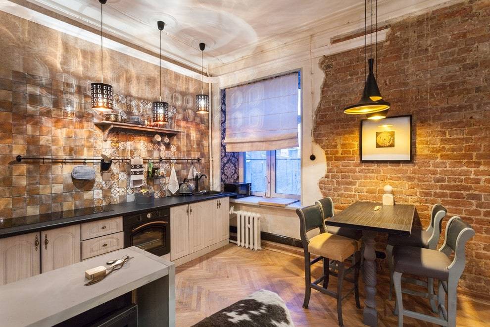 В зависимости от стиля кухни и общей цветовой гаммы интересно может смотреться фактурный фартук под камень, кирпич или бетон.