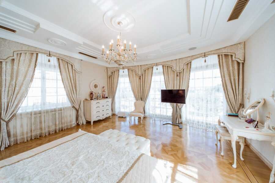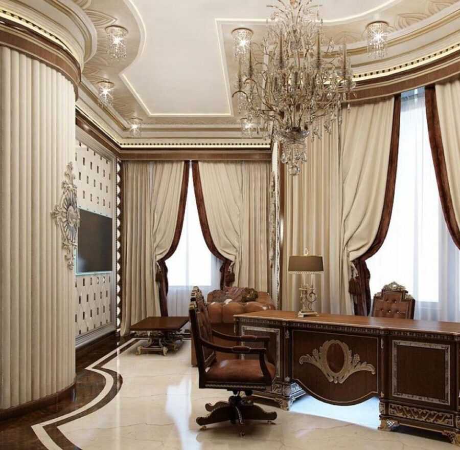 Для классических и неоклассических интерьеров подбирают шторы из плотной портьерной ткани, дополненные украшениями в виде подхватов, бахромы, подвесов. Часто шторы в классическом стиле делают в виде ламбрекена, сочетая ткань нескольких цветов.