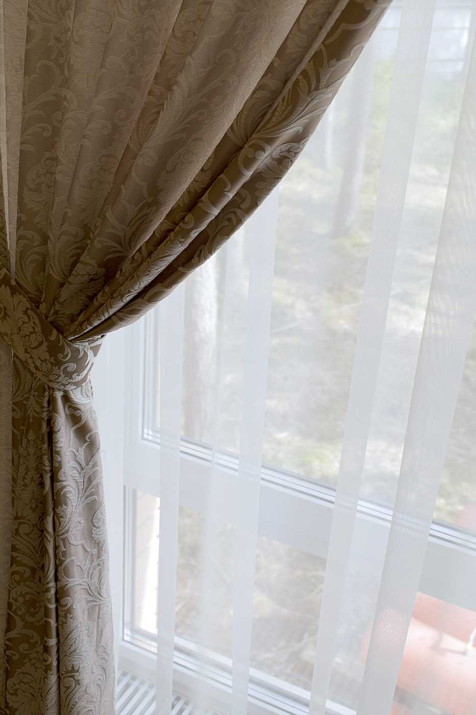 Качественные портьеры светлых тонов не нуждаются в дополнении другими тканями, хотя нередко к ним добавляют белый тюль. Тонкая вуаль пропускает достаточно солнечных лучей, обеспечивая рассеянный дневной свет.